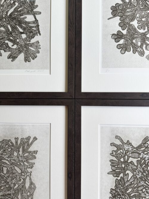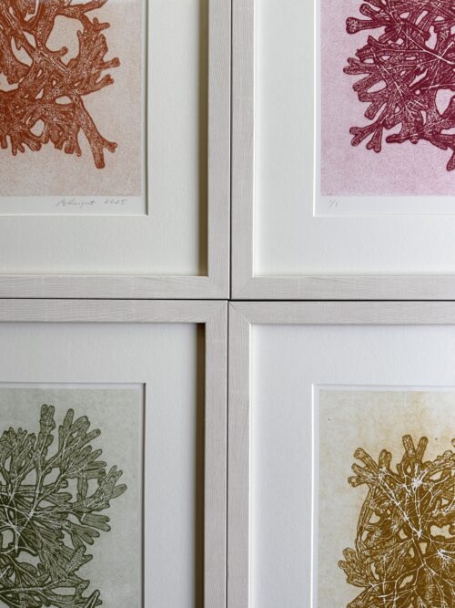 My contribution to the exhibition is a series of 12 monoprints made with Wracks. Wracks (Fucus) are a common but often overlooked group of seaweeds, so it’s wonderful to have the opportunity to highlight their amazing texture and shape in print. I began by allocating each species a colour, and then tested one in dark brown. I loved it! So I’ve chosen to show six monoprints in allocated colours, and six in the deepest raw umber. All original and each unique